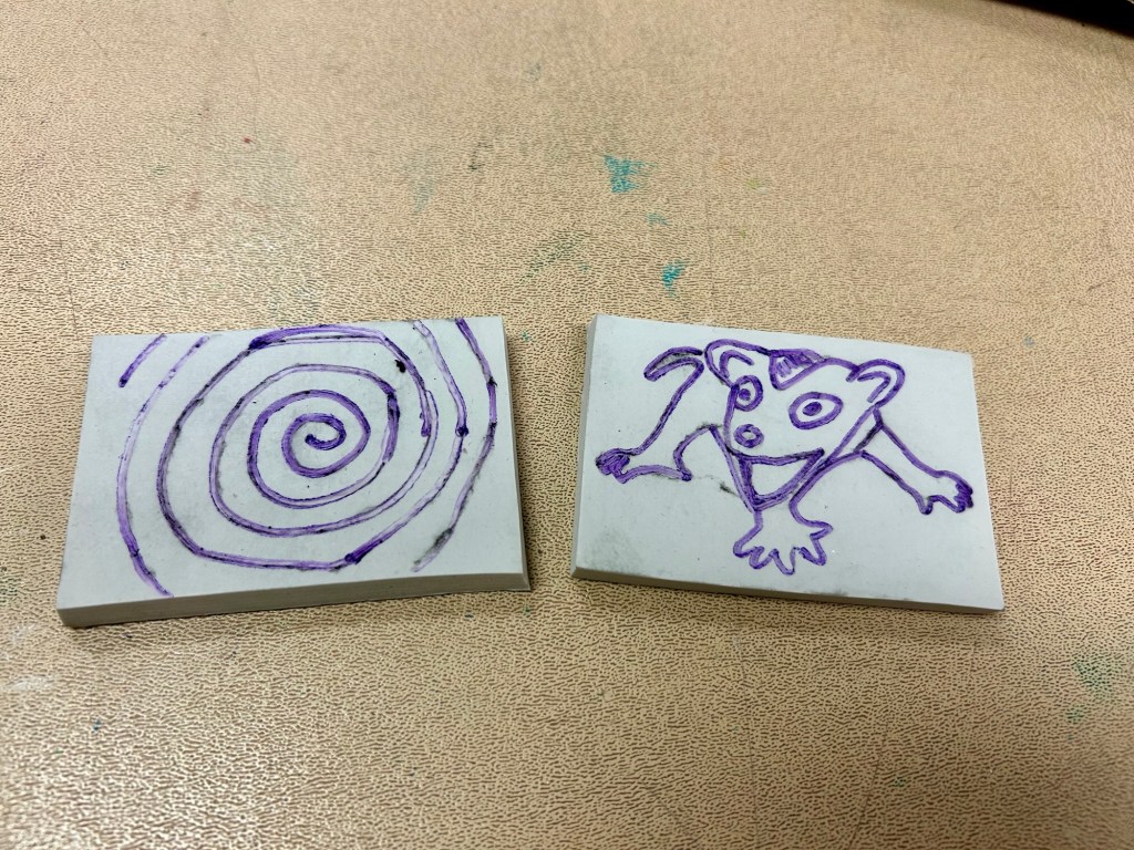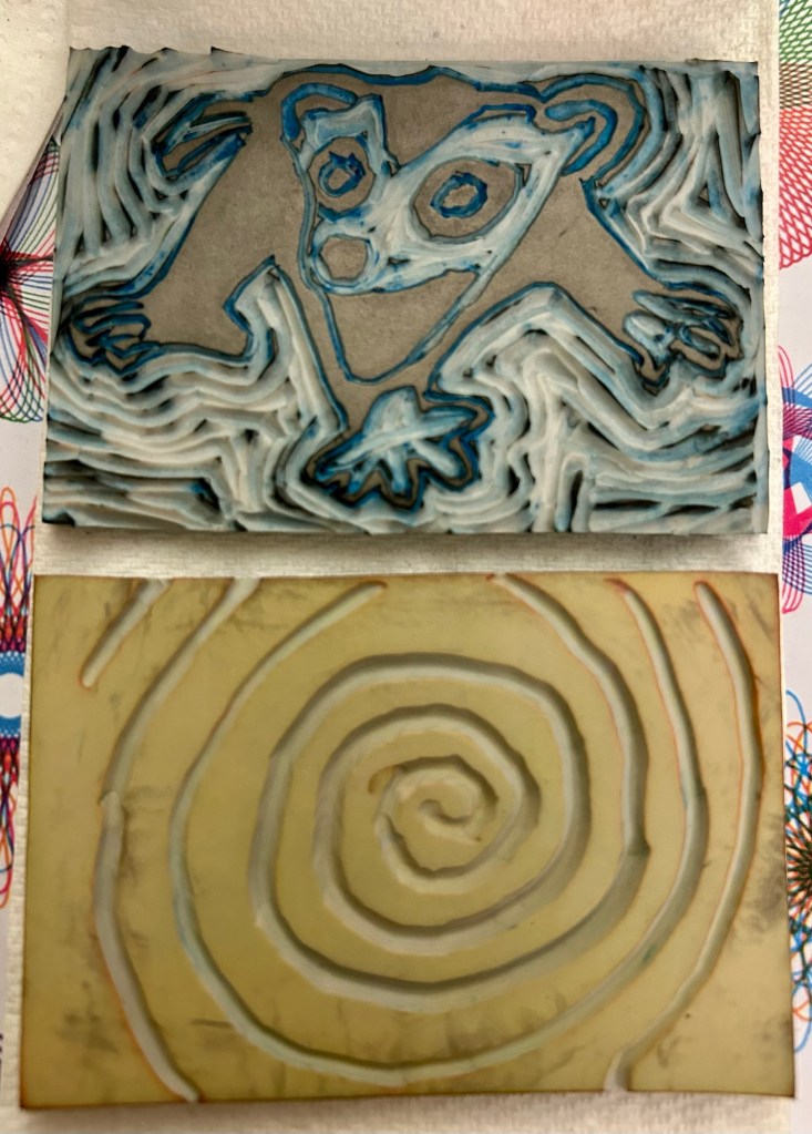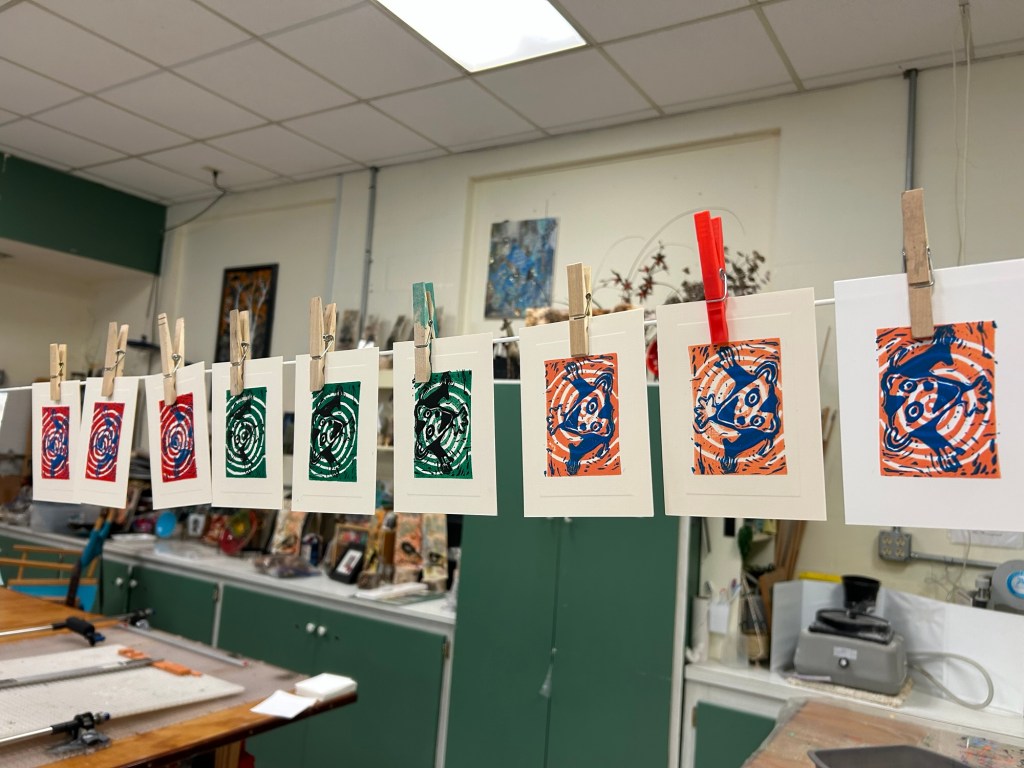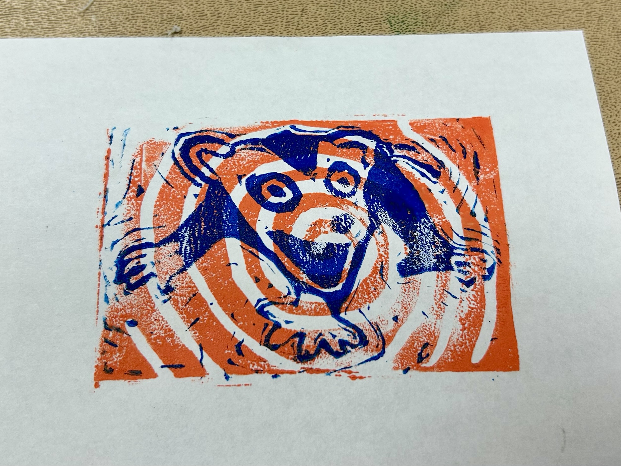 K, the instructor reminded me how to think about positive and negative space in printing. I worked quickly, looking at other people’s projects to see how they did it. In the end, I came out with at least three prints that would do pretty much what I wanted, and two lino blocks that I had, miraculously, cut just how I wanted them.