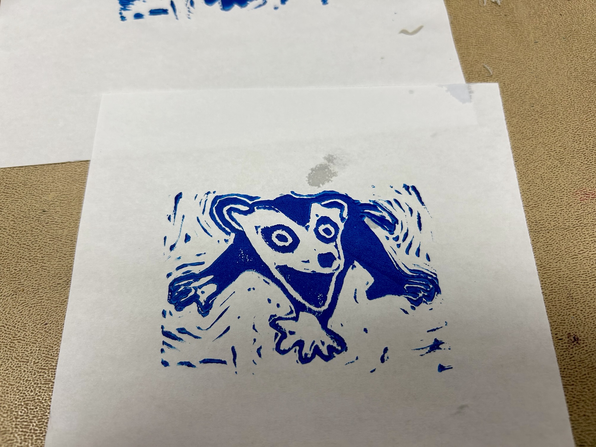 I tried linocut printmaking for the first time last week, in a one-off fun class at my neighborhood city art studio. I went in with a selfie I’d taken with a baby possum clinging to my shirt front, hoping to get something I could use as the main theme image for my website. My first attempt was successful beyond my wildest dreams.