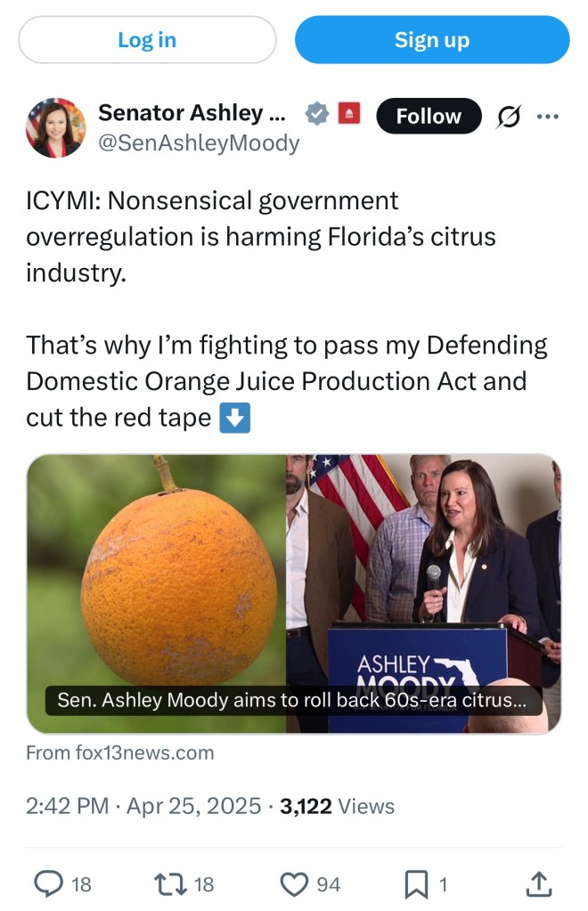 I just wanted to look this up because freshman Florida senator Ashley Moody sent me this breathless email about this absolutely critical bill she had cosponsored that will save Florida growers from the oppressive standards that the FDA graciously carved out for them in 1963, out of their own existing capacity, to protect them from competition from non-US growers.